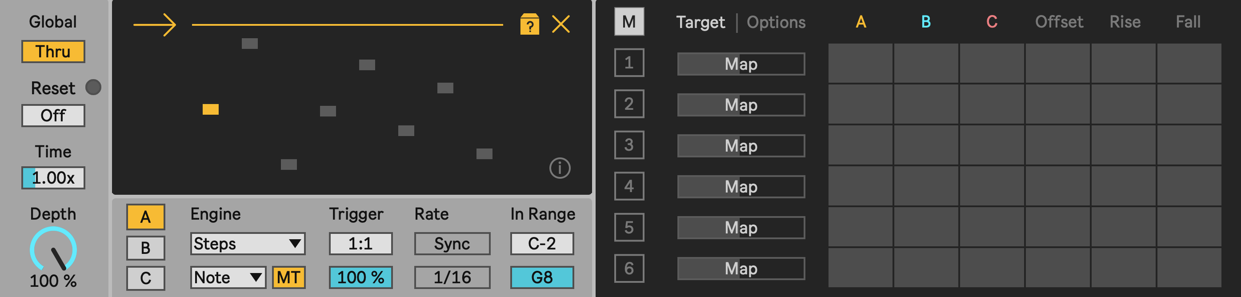 Staircase uses sequencers, probability, and MIDI data to modulate any mappable parameter in Live. The device features three source engines that can be summed to create complex and evolving modulation signals shaped by your live MIDI playback.